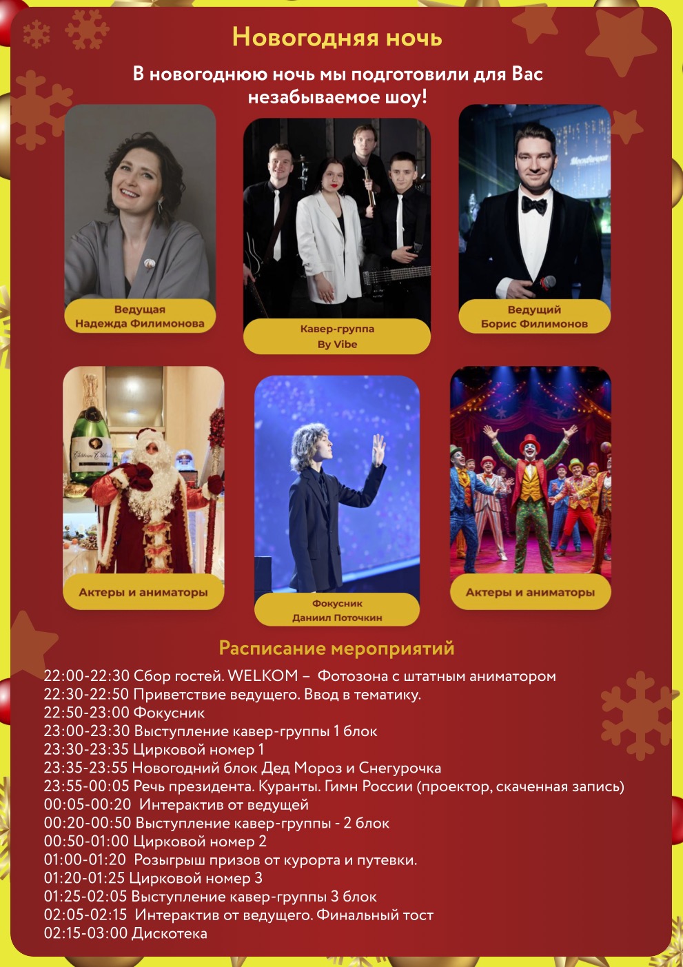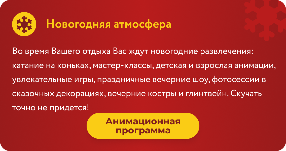Наш Курорт славится креативными сценариями. Например, в прошлом году дети «встречали Новый год шесть раз» — по часам поясов России, знакомясь с традициями разных регионов через игры и песни. И в этом году мы готовим для Вас увлекательную программу для всех.